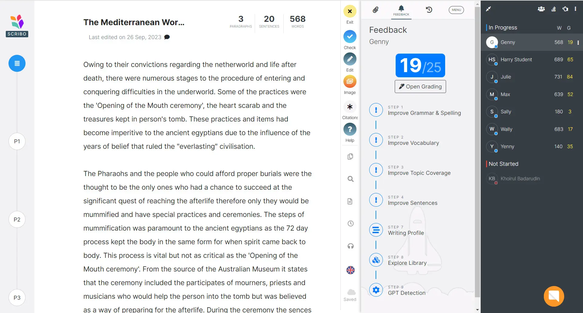 Live monitoring in Scribo brings a cohort view into view, managing progress, writing levels, writing plans and live feedback in one single interface.
