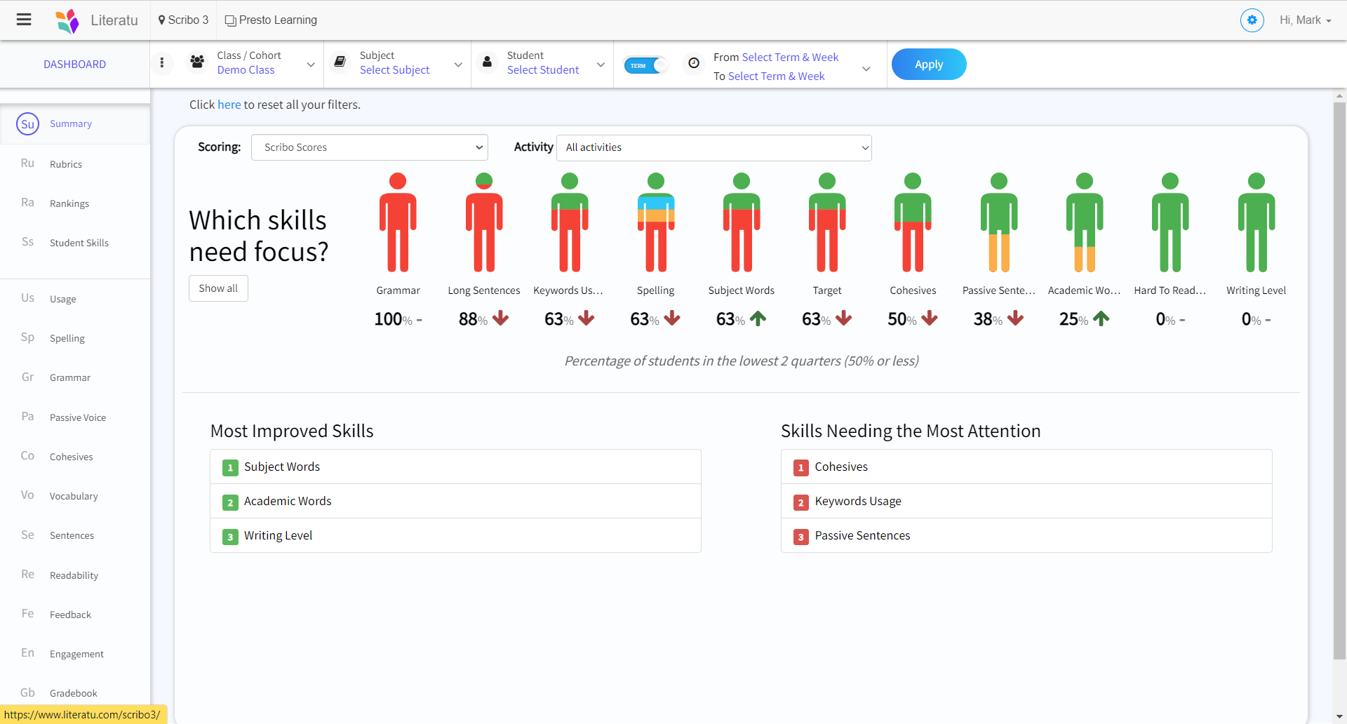 Without data across the breadth of elements that go into good writing, teachers are left to intuition and more hours of self-discovery. Scribo builds data from every student and teacher writing check, automatically presenting data in visible dissections for cohorts, subjects, teachers, year levels, schools and district level analysis.